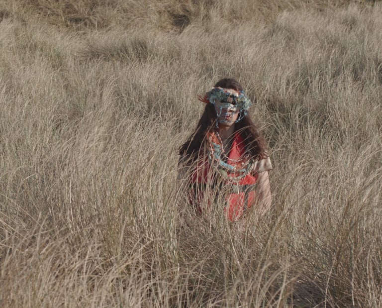 Ces costumes et masques ont été réalisés pour le projet audiovisuel et l’installation de l’artiste Toudou/Lou Morlier. J’ai eu recours à des savoirs faire artisanaux comme la broderie, la teinture végétale, la vannerie, le tissage,...). Ils ont été fabriqués à partir de matériaux glanés et recyclés au fil des marches.