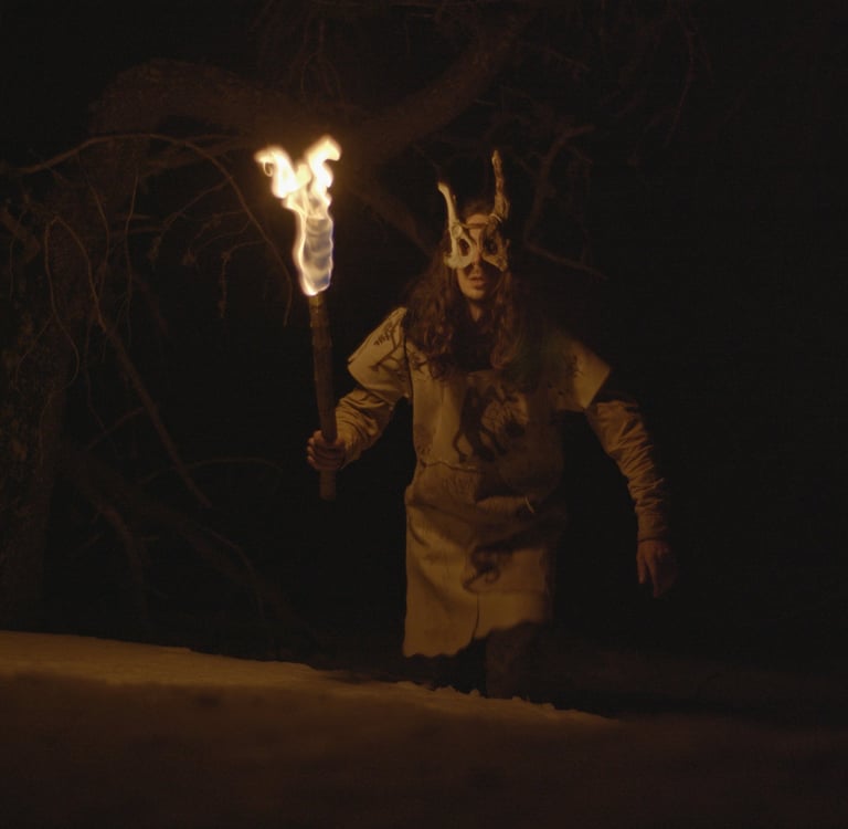 Poupée en vertèbre et scoubidous, masque en écorce de châtaigner, cagoule de coton et lichens, poncho en velours avec broderies de plumes de faucons et coquillages