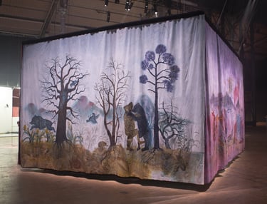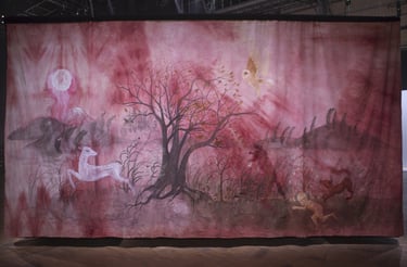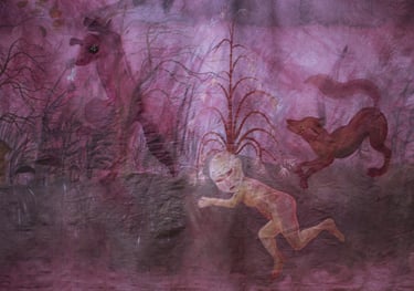 L’installation joue ici le rôle d’un sas, entre l’espace d’exposition et le film, dont elle “déploie” le décor. Le terme « Séouve » signifie forêt en provençal, et renvoie au décor du film, un village des Alpes de Haute Provence. Cette peinture représente une forêt merveilleuse habitée par des animaux psychopompes (loups, sangliers, corbeaux, cerfs, renards,...) connus pour leur rôle de passeurs d’âmes dans différentes cultures occidentales. Ces animaux sont pris dans une ronde, qui renvoie au motif de la danse macabre, mais aussi aux cycles des saisons. Dans cette forêt fabuleuse se noue différentes relations, des étreintes, des chasses, des jeux. Les humain.es n’y sont présents que sous des formes hybrides. Ils sont humus, compost, mandragores, êtres mycorhizes racines et nourriciers. Ces chimères humain.es-plantes évoluent de manière cyclique au sein de l’installation. Au printemps la femme plante est enceinte d’un lys; à l’été des fœtus et nourrissons bourgeonnent, à l’automne nous sommes avec une jeune femme qui est sortie du sol mais dont la chevelure flétrit déjà, et à l’hiver c’est une fougère vieillard racine rabougrie qui se recroqueville au cœur de la terre. Dans l’imaginaire occidental, la forêt joue un rôle ambivalent. Elle est dans toutes les sociétés archaïques, notre « origine », souvent comparée à une femme, à une déesse mère. Mais elle incarne aussi notre part d’ombre, de mystère, d’animalité. De l’antiquité à l’époque moderne; et encore aujourd’hui les institutions humaines occidentales (la loi, la cité, la religion, l’ordre moral) se construisent en opposition à la forêt. On la défriche pour construire la cité, la transformer en terre agricole, on exploite ses ressources. Le territoire sylvestre recule, et la forêt devient le dehors, l’espace de l’altérité. Au moyen âge c’est un espace où s’applique des lois spécifiques, où vont se réfugier les marginaux (mendiants, aliénés, amants, bandits, brigands, ermites,…).