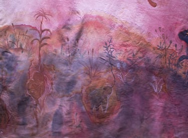 encre acrylique et teinture végétale sur coton, broderie 2m80 x19,5m, 2025