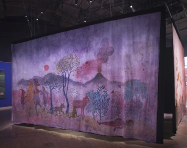 La grande Séouve est une installation textile créée pour le contexte de la grande Halle de la Villette, et l’exposition 100%. Elle est composée de 4 pans de tissus formant un rectangle au sein duquel est présenté le film Tohu va bohu. Chacun de ces pans est d’abord teint de manière naturelle: noix de galle, néflier, garance, indigo et bois de campêche. Il est ensuite peint à l’encre acrylique et enfin les yeux des animaux sont brodés au fil de coton.