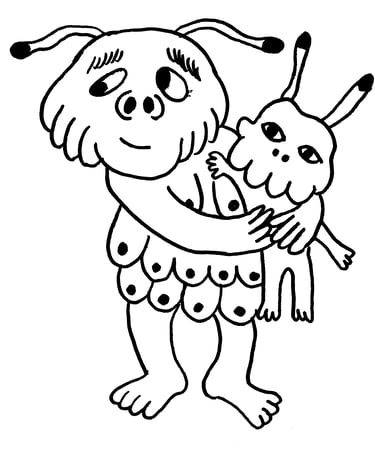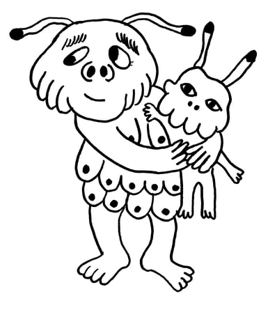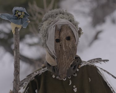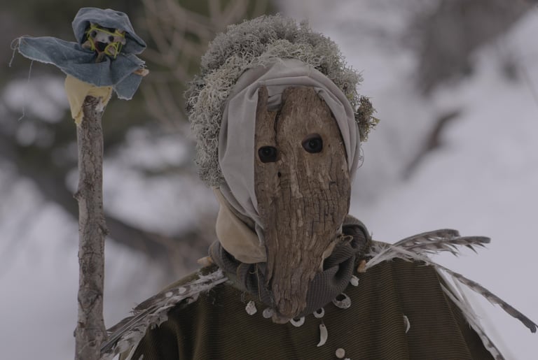 Poupée en vertèbre et scoubidous, masque en écorce de châtaigner, cagoule de coton et lichens, poncho en velours avec broderies de plumes de faucons et coquillages