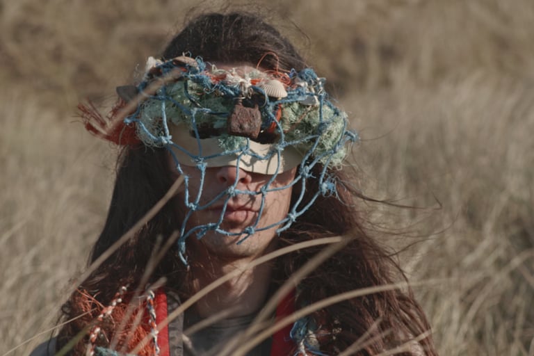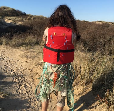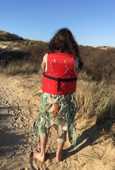 Broderie sur gilet de sauvetage, robe et masque en tissage de cordes marines trouvées à Dunkerque