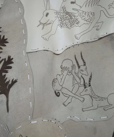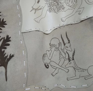 Tunique réalisée en patchwork de cuir récupéré d’un canapé, dessins gravés au laser.