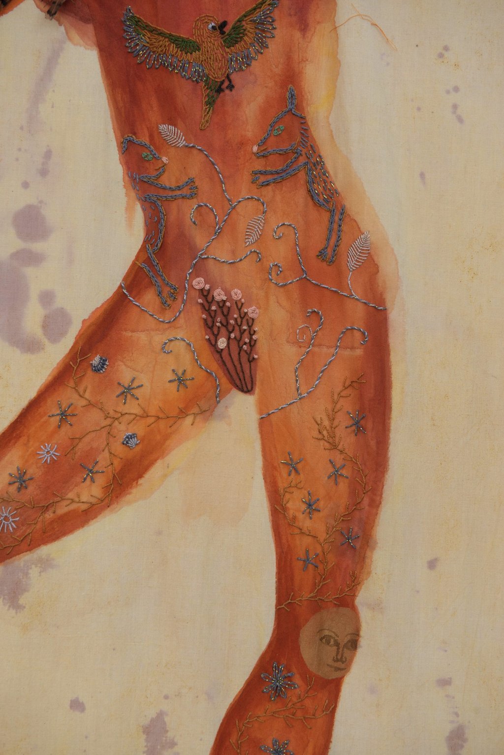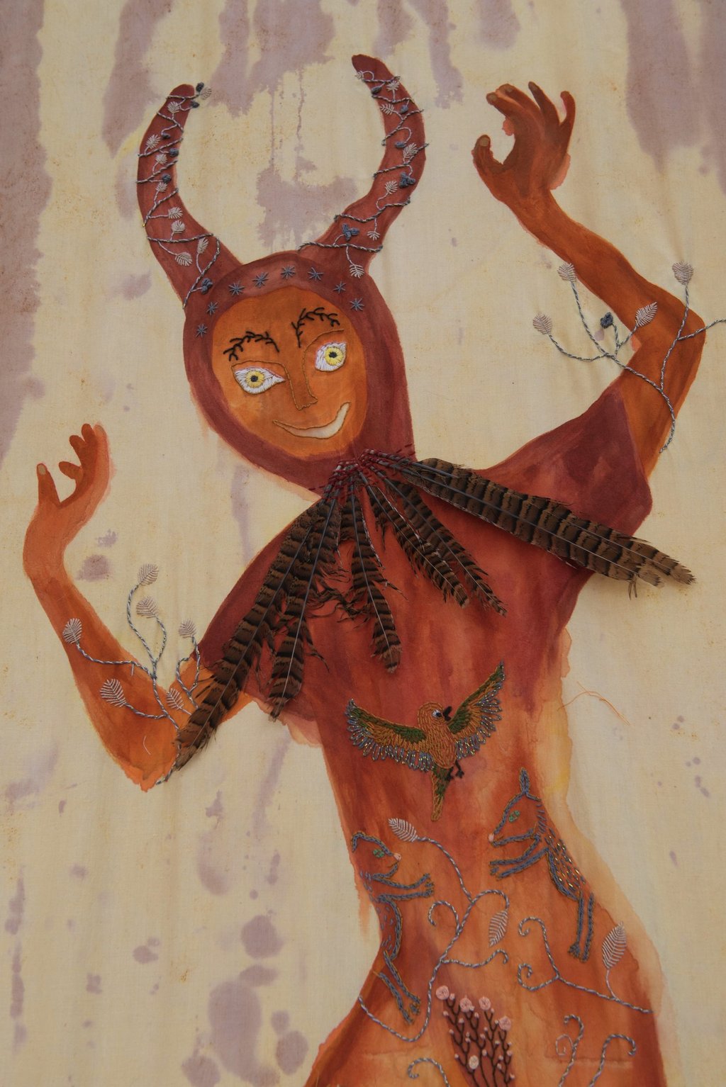 La surface est teinte dans du curcuma, avant que le personnage ne soit peint puis brodé. Je considère la broderie comme un procédé graphique, qui vient inscrire en relief des motifs sur la toile, à ceci prêt qu’elle vient trouer la matière. Ainsi elle devient une cicatrice, et un tatouage. C’est aussi une image dans l’image, celle de motifs qui viennent parsemer les costumes des fripons, dépassant une simple fonction ornementale pour devenir de nouveaux personnages, animaux et végétaux. Autour du cou de l’Esprit à l’oiseau et de l’ Esprit au lion sont accrochées un ensemble de plumes de pie, faisane et canard, récoltées au gré de mes promenades