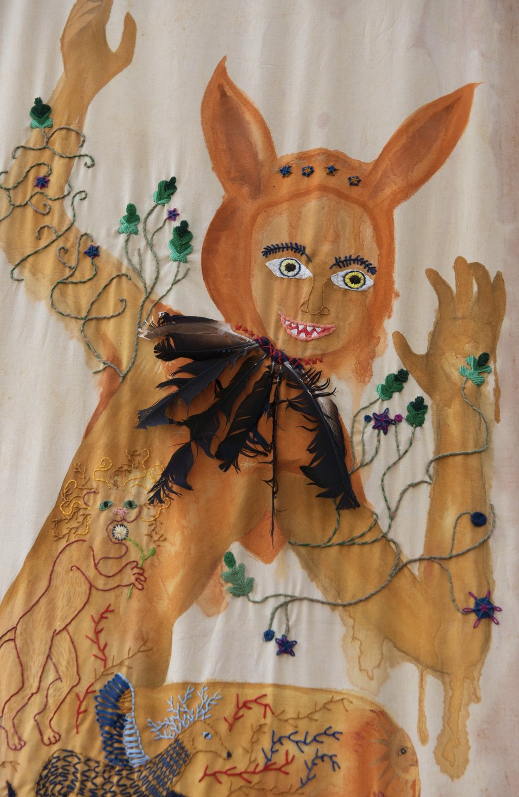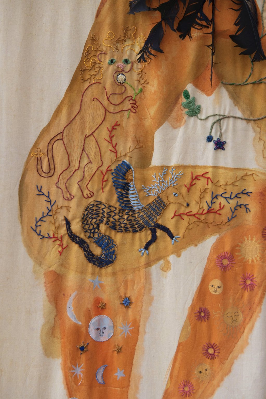 Esprit au lion, encre acrylique et fil à broder, plumes de pies, canard, coton teint au curcuma,72x235cm, 2023