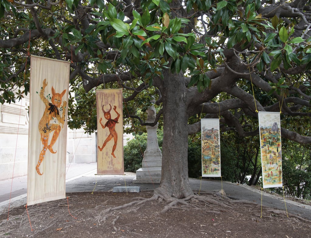 Ces deux peintures brodées, nommées respectivement Esprit à l’oiseau et Esprit au lion, sont pensées comme des bannières mettant en scène deux personnages de «trickster» ou «fripon». en français. Cette figure présente dans différents folklores est celle d’un passeur entre le monde humain et celui des dieux ou des esprits. Ce lien qu’il établit entre deux mondes lui donne un caractère paradoxal. Il est tour à tour bon et mauvais, farceur et sérieux. C’est un personnage solitaire et subversif qui bouscule la hiérarchie des institutions divines et humaines. Sa complexité et sa dimension corrosive m’intéresse, et le font rejoindre le panthéon des figures auxquelles je m’attache dans mon travail, comme celle du fou ou de l’idiote.