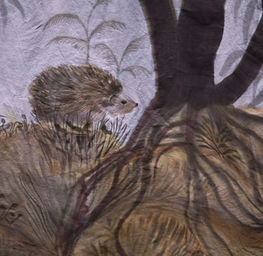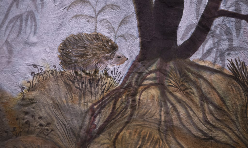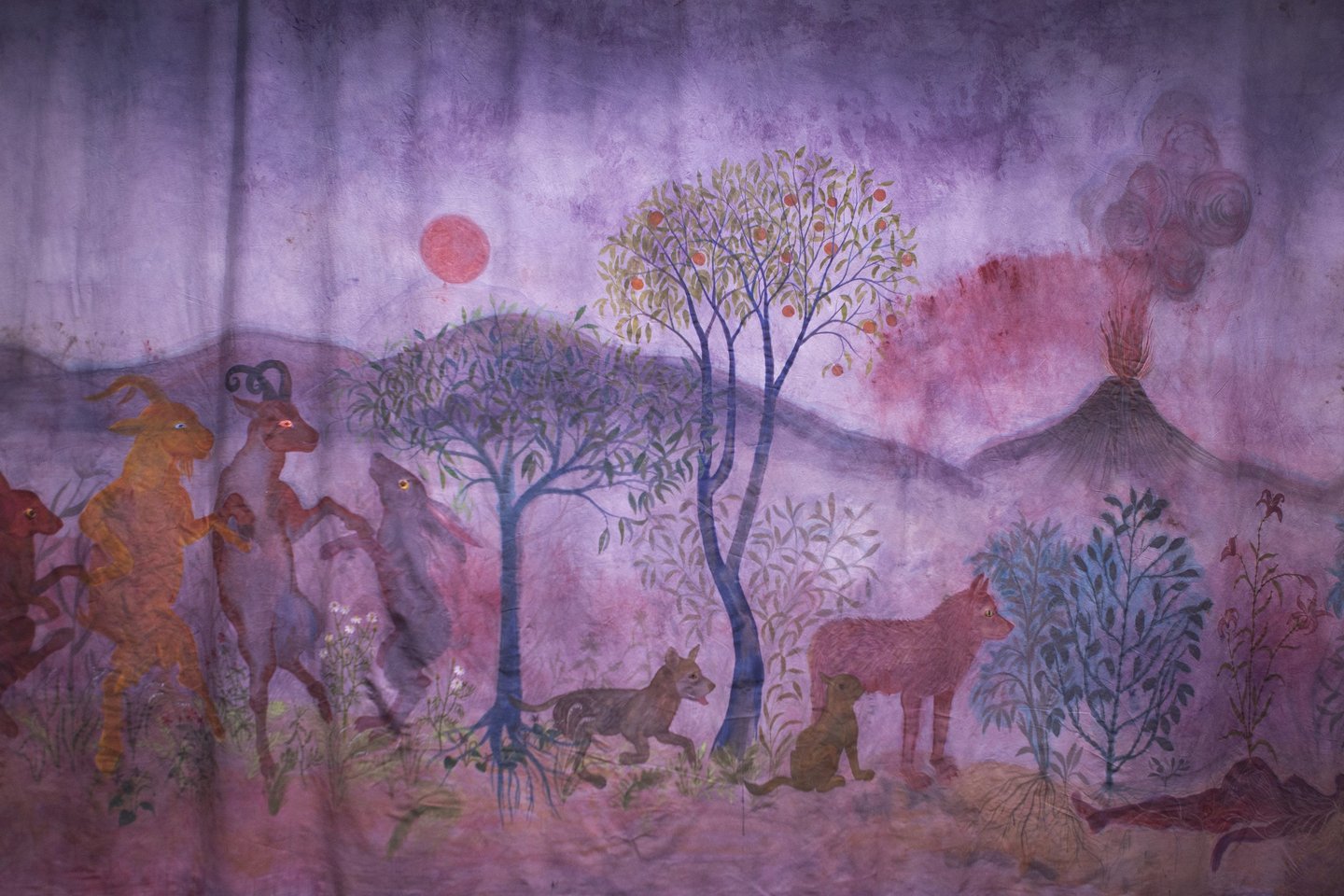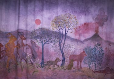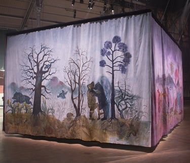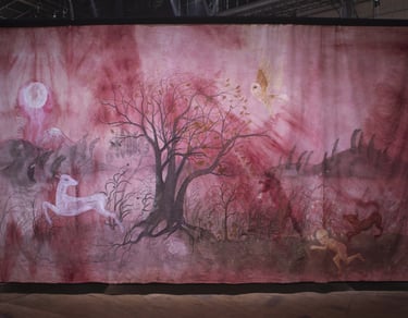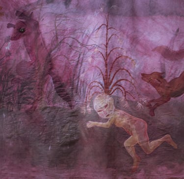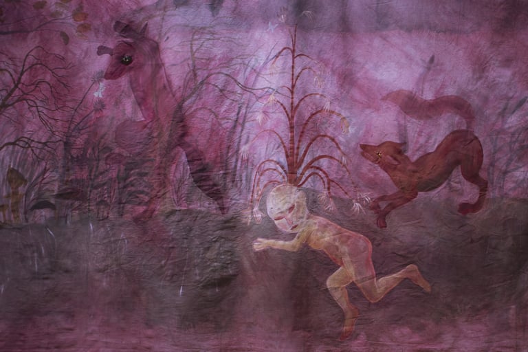 L’installation joue ici le rôle d’un sas, entre l’espace d’exposition et le film, dont elle “déploie” le décor. Le terme « Séouve » signifie forêt en provençal, et renvoie au décor du film, un village des Alpes de Haute Provence. Cette peinture représente une forêt merveilleuse habitée par des animaux psychopompes (loups, sangliers, corbeaux, cerfs, renards,...) connus pour leur rôle de passeurs d’âmes dans différentes cultures occidentales. Ces animaux sont pris dans une ronde, qui renvoie au motif de la danse macabre, mais aussi aux cycles des saisons. Dans cette forêt fabuleuse se noue différentes relations, des étreintes, des chasses, des jeux. Les humain.es n’y sont présents que sous des formes hybrides. Ils sont humus, compost, mandragores, êtres mycorhizes racines et nourriciers. Ces chimères humain.es-plantes évoluent de manière cyclique au sein de l’installation. Au printemps la femme plante est enceinte d’un lys; à l’été des fœtus et nourrissons bourgeonnent, à l’automne nous sommes avec une jeune femme qui est sortie du sol mais dont la chevelure flétrit déjà, et à l’hiver c’est une fougère vieillard racine rabougrie qui se recroqueville au cœur de la terre. Dans l’imaginaire occidental, la forêt joue un rôle ambivalent. Elle est dans toutes les sociétés archaïques, notre « origine », souvent comparée à une femme, à une déesse mère. Mais elle incarne aussi notre part d’ombre, de mystère, d’animalité. De l’antiquité à l’époque moderne; et encore aujourd’hui les institutions humaines occidentales (la loi, la cité, la religion, l’ordre moral) se construisent en opposition à la forêt. On la défriche pour construire la cité, la transformer en terre agricole, on exploite ses ressources. Le territoire sylvestre recule, et la forêt devient le dehors, l’espace de l’altérité. Au moyen âge c’est un espace où s’applique des lois spécifiques, où vont se réfugier les marginaux (mendiants, aliénés, amants, bandits, brigands, ermites,…).
