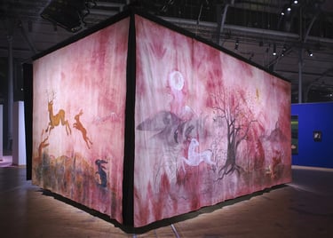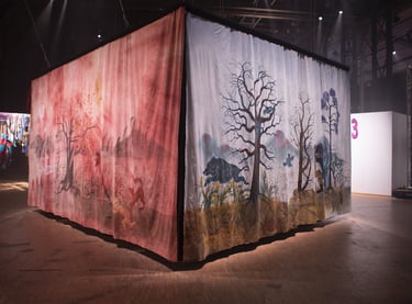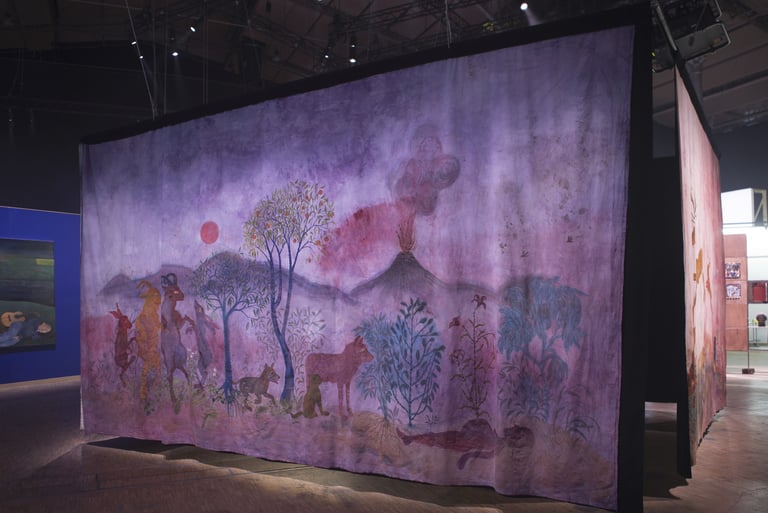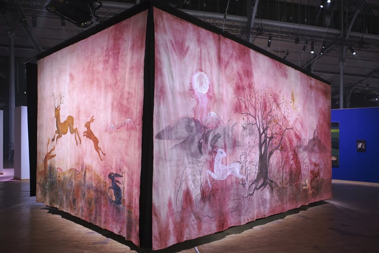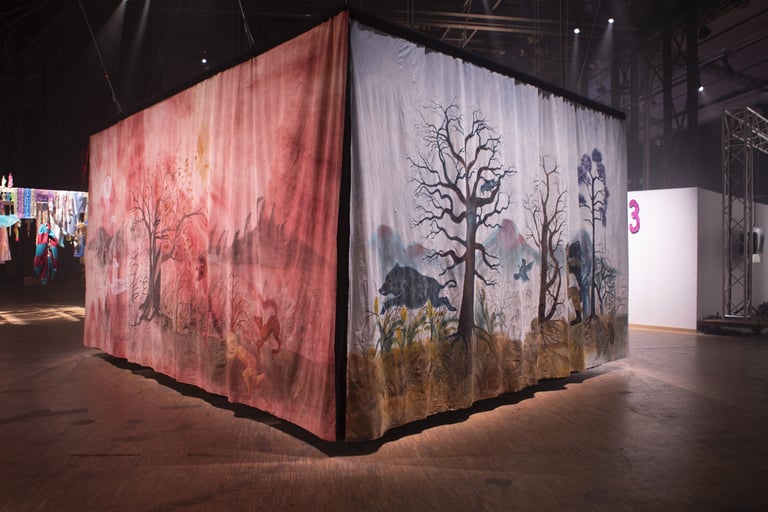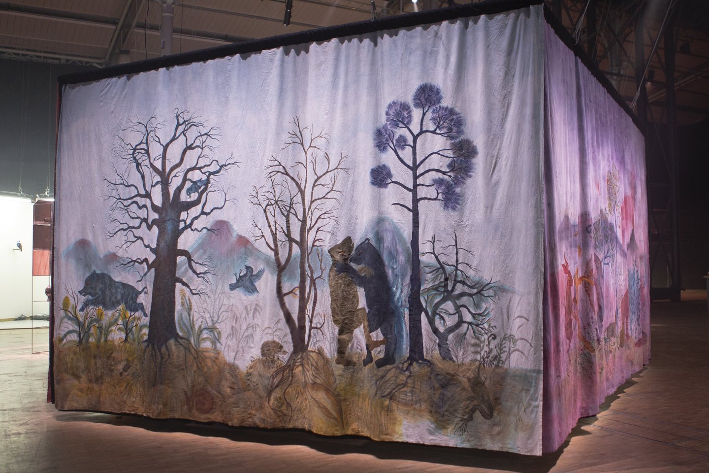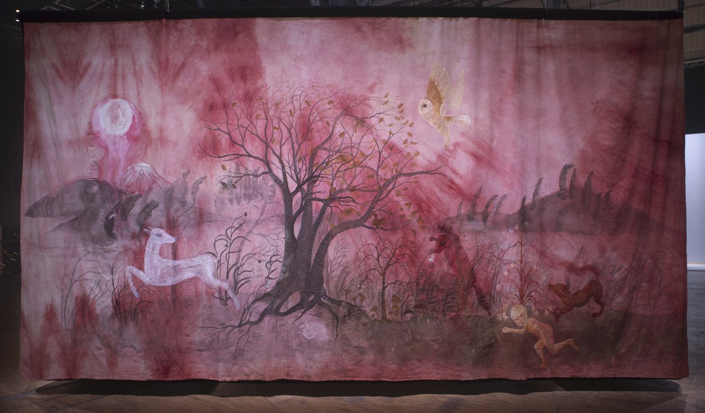 La grande Séouve est une installation textile créée pour le contexte de la grande Halle de la Villette, et l’exposition 100%. Elle est composée de 4 pans de tissus formant un rectangle au sein duquel est présenté le film Tohu va bohu. Chacun de ces pans est d’abord teint de manière naturelle: noix de galle, néflier, garance, indigo et bois de campêche. Il est ensuite peint à l’encre acrylique et enfin les yeux des animaux sont brodés au fil de coton.