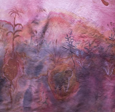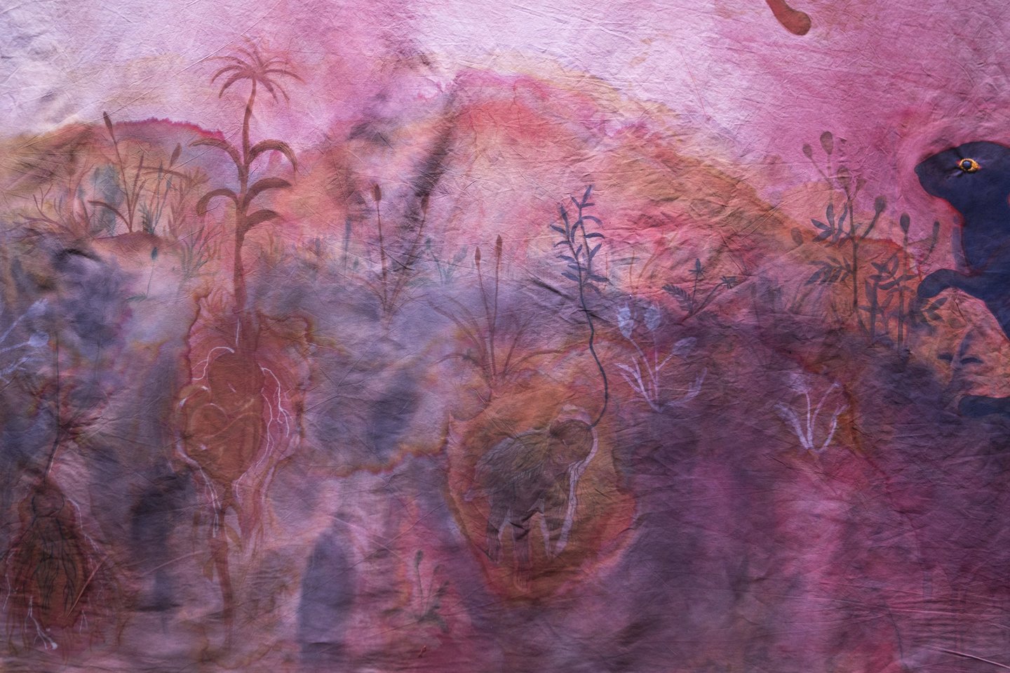 encre acrylique et teinture végétale sur coton, broderie 2m80 x19,5m, 2025