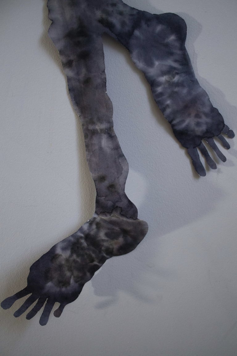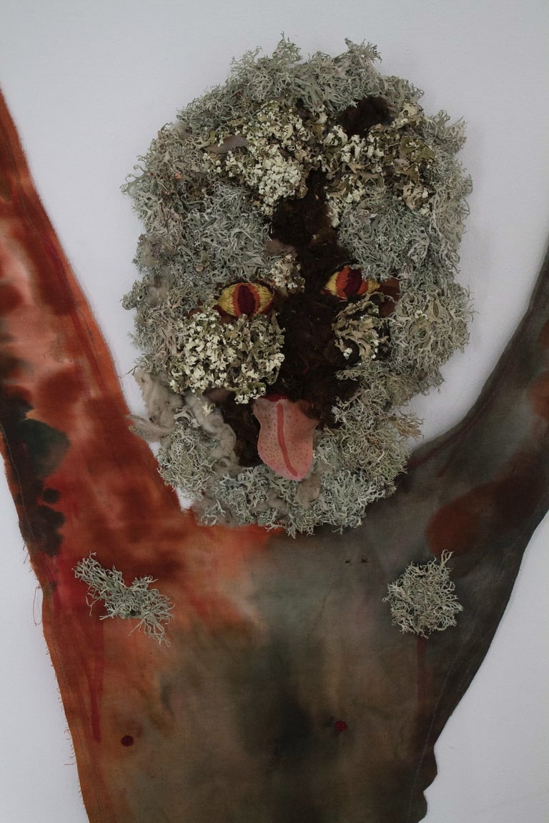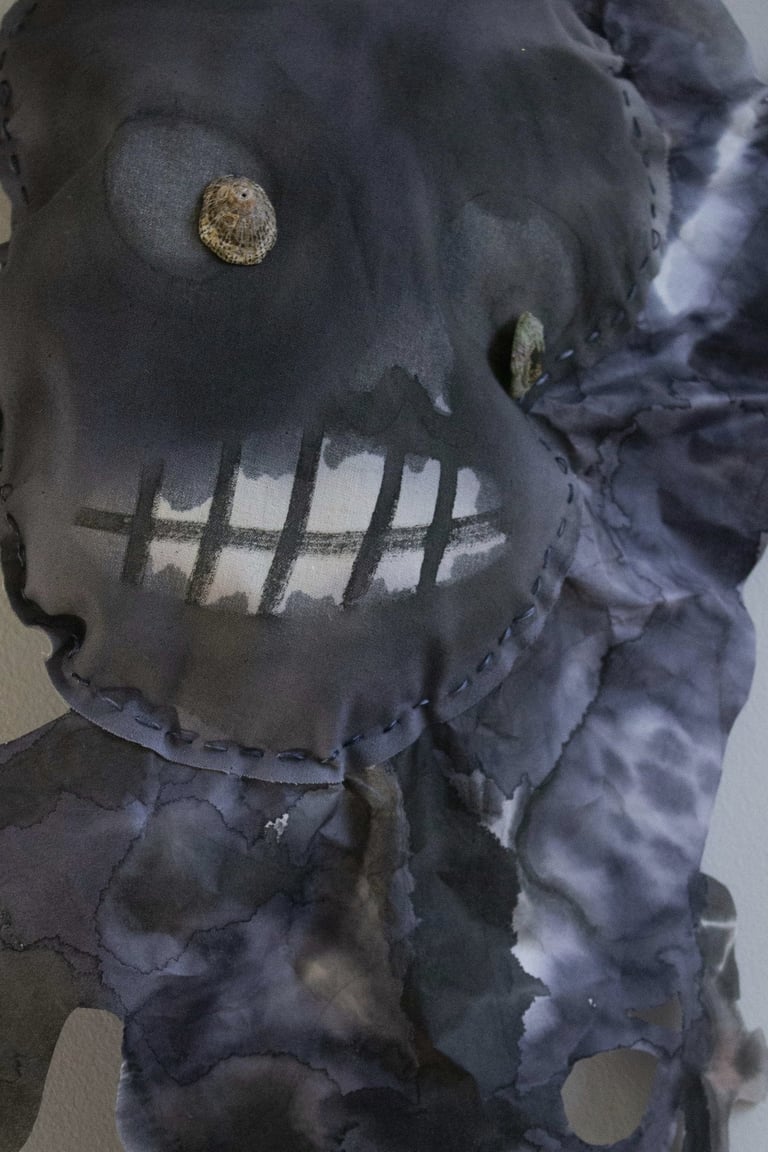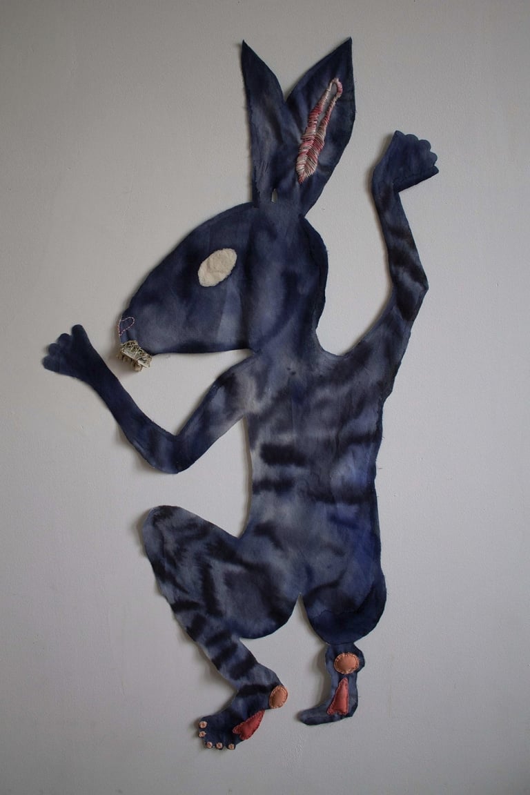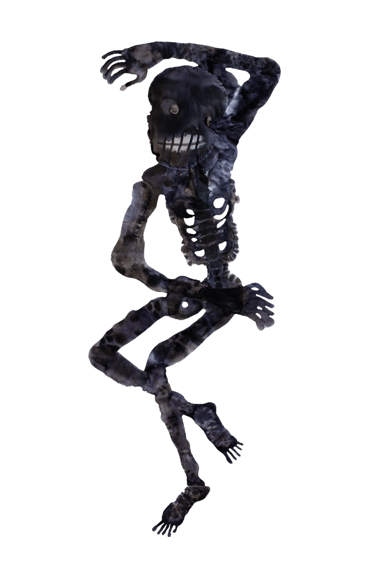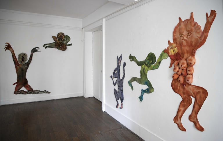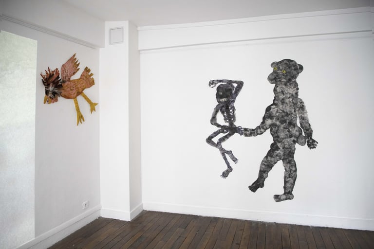 Sur les murs de la pièce, se trouvent des personnages - silhouettes textiles dessinées et peintes sur lesquelles certains éléments sont accrochés comme des excroissances corporelles. La peinture appliquée sur le tissu se diffuse par ailleurs à la manière d’un organisme vivant qui progresserait à la surface de son hôte, modifiant jusqu’à ses caractéristiques charnelles. Les silhouettes au mur en appellent presque au registre du costumes : elles sont à l’échelle du corps des spectateur·rices. Ces dernier·ères se trouvent ainsi pris·es dans le mouvement suggéré de ces entités, dans un lieu où même le son du film vient contaminer le rapport à l’espace. La danse commune trans-espèce humaine et animale existe en dehors de l’écran, dans un déploiement qui étend la narration. C’est une ronde qui renoue avec les représentations de danses macabres médiévales. Dans ces farandoles, différents personnages de classes sociales disparates se retrouvaient pour danser avec des figures macabres, soulignant ainsi l’égalité de chacun·e face à la mort. Ici, l’installation convoque une mère douce et monstrueuse, un angelot papillon et squelette, un ours noir, un cerf aux bois végétaux, un lapin bleu, un squelette grimaçant. Autant de figures ambigües, oscillant entre un registre lugubre et joyeux. Les personnages représentés accentuent d’autant plus la déhiérarchisation entre un vivant représentable et ce que l’on tendrait à considérer comme monstrueux. Par leur hybridité, les figures semblent faire fi de la binarité entre humain et animal. Leur caractère multiple et festif place le monstrueux comme l’élément qui, par son dépassement, efface la frontière entre réel et merveilleux, entre la rationalité humaine et la nécessaire animalité