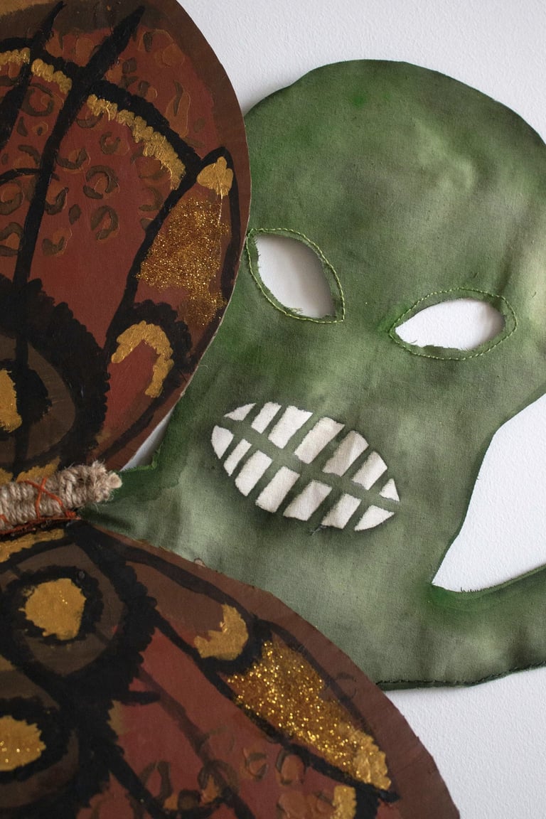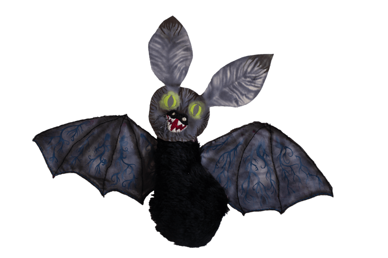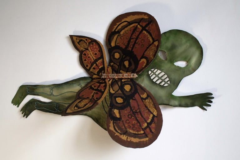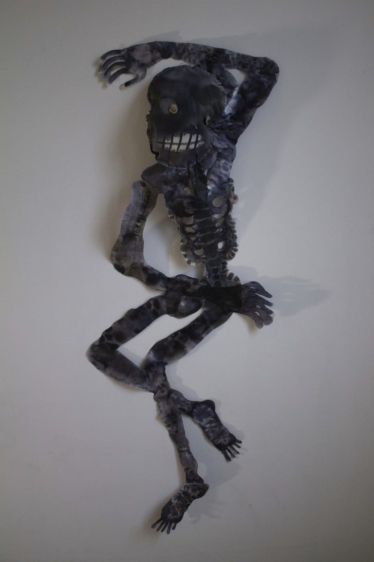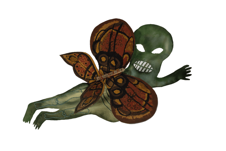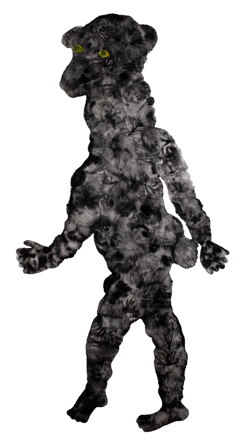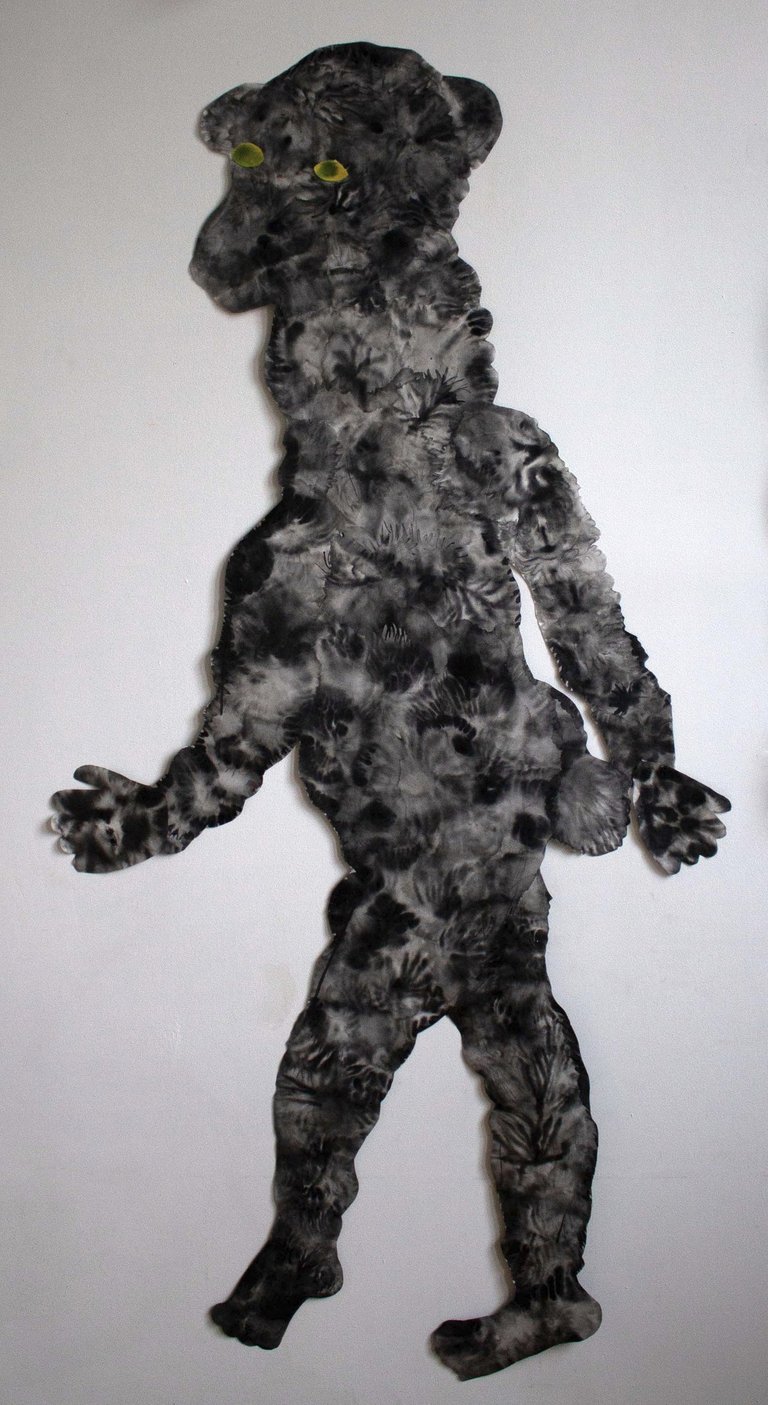 Sur les murs de la pièce, se trouvent des personnages - silhouettes textiles dessinées et peintes sur lesquelles certains éléments sont accrochés comme des excroissances corporelles. La peinture appliquée sur le tissu se diffuse par ailleurs à la manière d’un organisme vivant qui progresserait à la surface de son hôte, modifiant jusqu’à ses caractéristiques charnelles. Les silhouettes au mur en appellent presque au registre du costumes : elles sont à l’échelle du corps des spectateur·rices. Ces dernier·ères se trouvent ainsi pris·es dans le mouvement suggéré de ces entités, dans un lieu où même le son du film vient contaminer le rapport à l’espace. La danse commune trans-espèce humaine et animale existe en dehors de l’écran, dans un déploiement qui étend la narration. C’est une ronde qui renoue avec les représentations de danses macabres médiévales. Dans ces farandoles, différents personnages de classes sociales disparates se retrouvaient pour danser avec des figures macabres, soulignant ainsi l’égalité de chacun·e face à la mort. Ici, l’installation convoque une mère douce et monstrueuse, un angelot papillon et squelette, un ours noir, un cerf aux bois végétaux, un lapin bleu, un squelette grimaçant. Autant de figures ambigües, oscillant entre un registre lugubre et joyeux. Les personnages représentés accentuent d’autant plus la déhiérarchisation entre un vivant représentable et ce que l’on tendrait à considérer comme monstrueux. Par leur hybridité, les figures semblent faire fi de la binarité entre humain et animal. Leur caractère multiple et festif place le monstrueux comme l’élément qui, par son dépassement, efface la frontière entre réel et merveilleux, entre la rationalité humaine et la nécessaire animalité