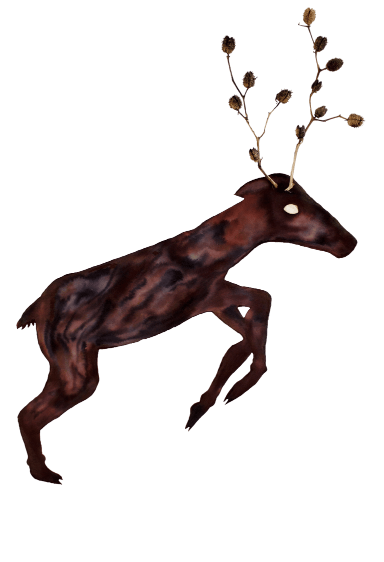Cerf aux bois du diable, encre sur coton, tiges de daturas séchés (herbe des sorcières), 105x100cm, 2023