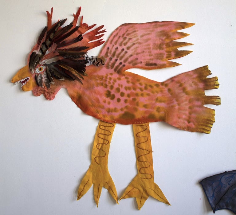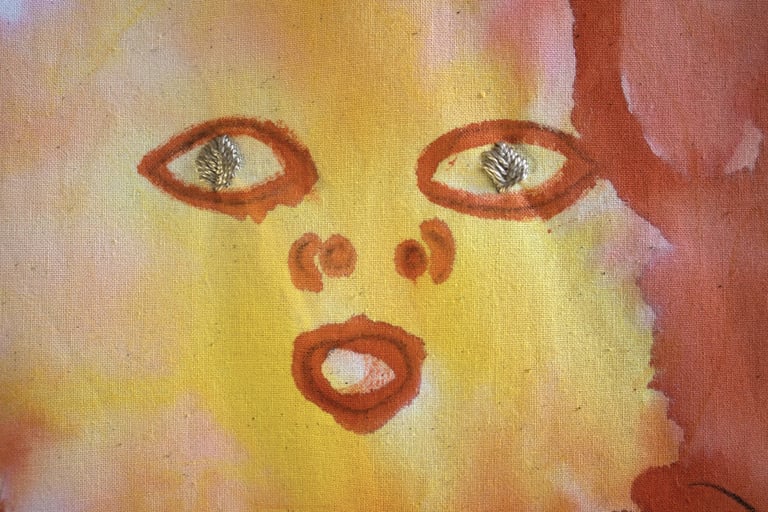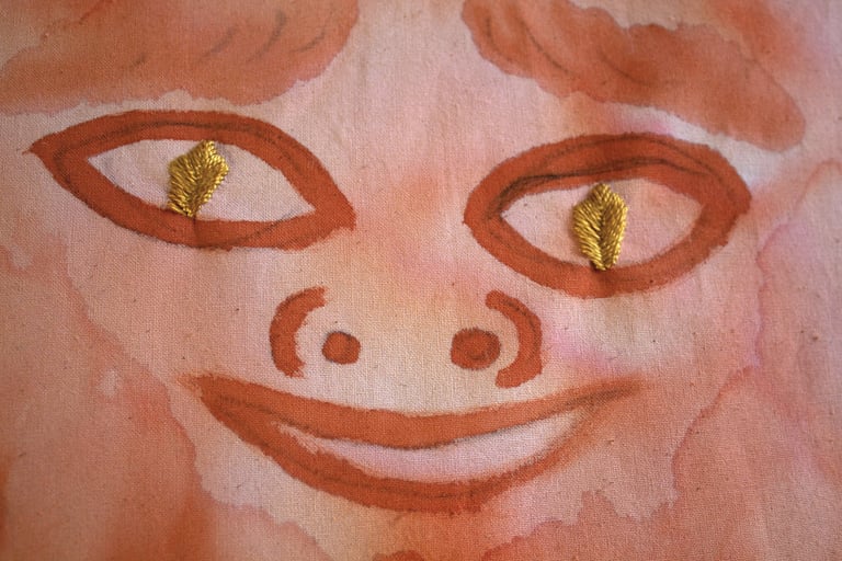 Angelot, encre sur coton, peinture acrylique sur carton, fil de coton et ficelle de jute, 76x55cm, 2023