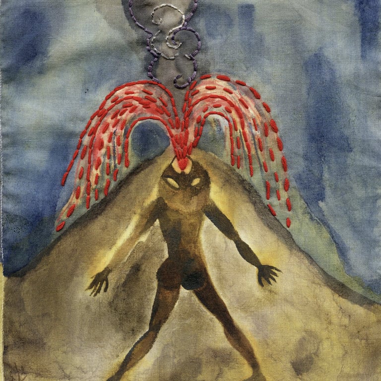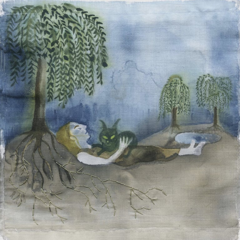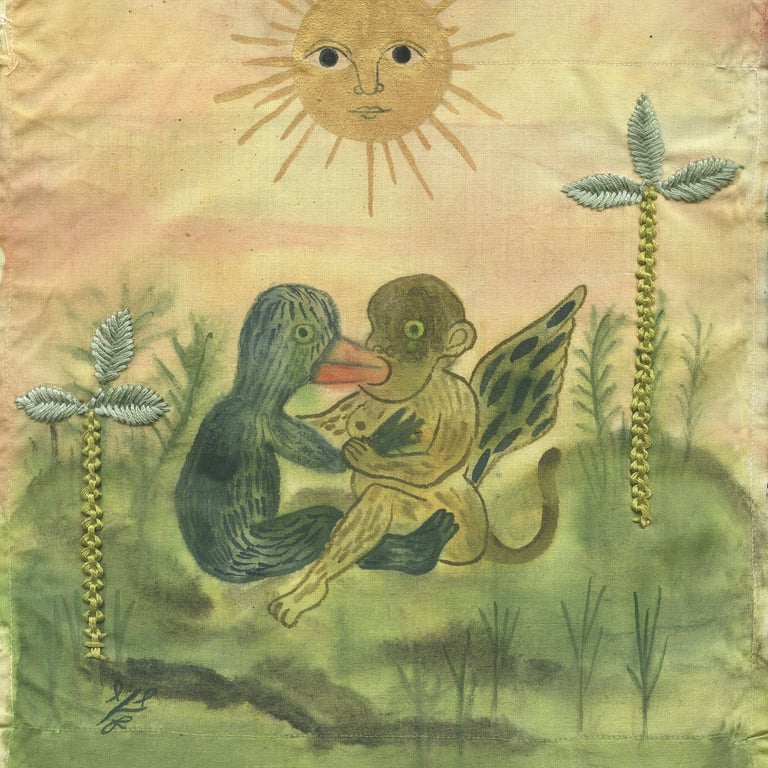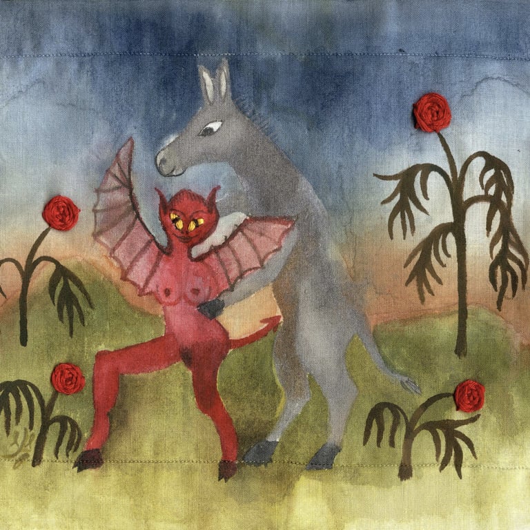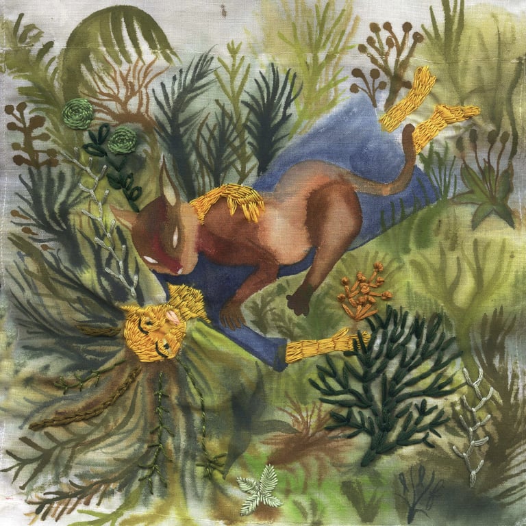 Série Les chimères amoureuses, encre sur coton et broderie, 28x25 cm, 2023